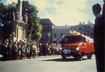 Endlich wurde am 2. September die erste neue Motorspritze von Rosenbauer mit Breuer Motor Typ 2 mit 17 PS und 600 Liter Fördermenge je Minute von Frau Käthe Kral übergeben. Diese Motorspritze kann heute noch im Feuerwehrhaus besichtigt werden.